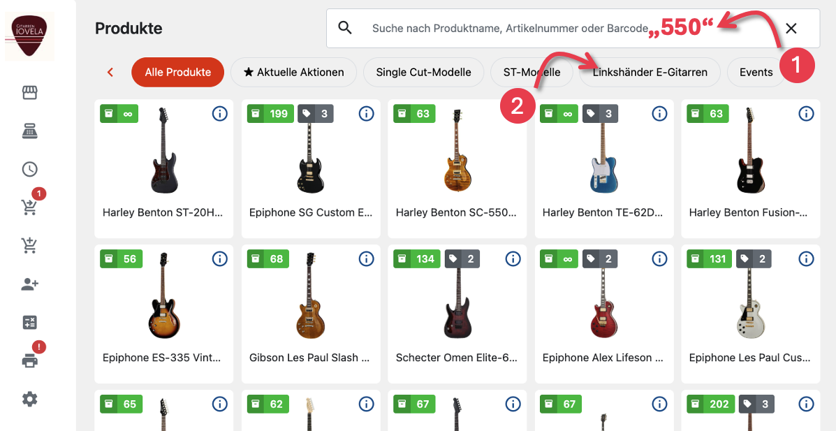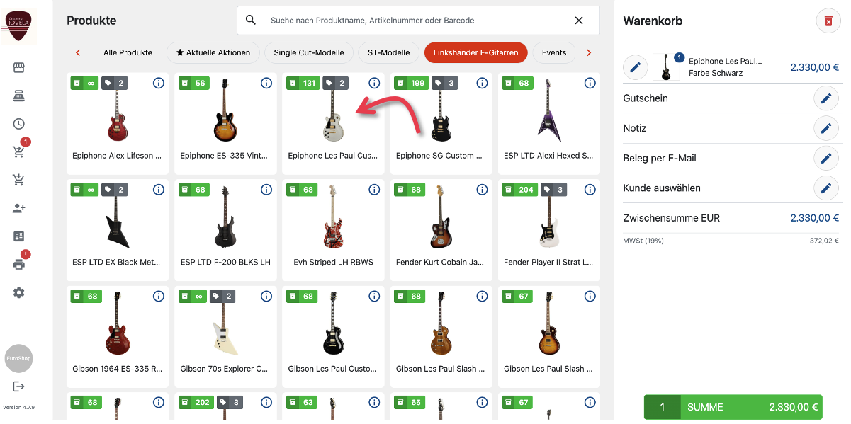 | Suche löschen, Kategorie anklicken: Linkshänder-Gitarren | Produktgruppe wird angezeigt. | (Natürlich kann auch ein Scanner angeschlossen werden, dann wird das Produkt direkt in den Warenkorb gelegt.) Am Produkt haben wir den Warenbestand und das Info-i. |