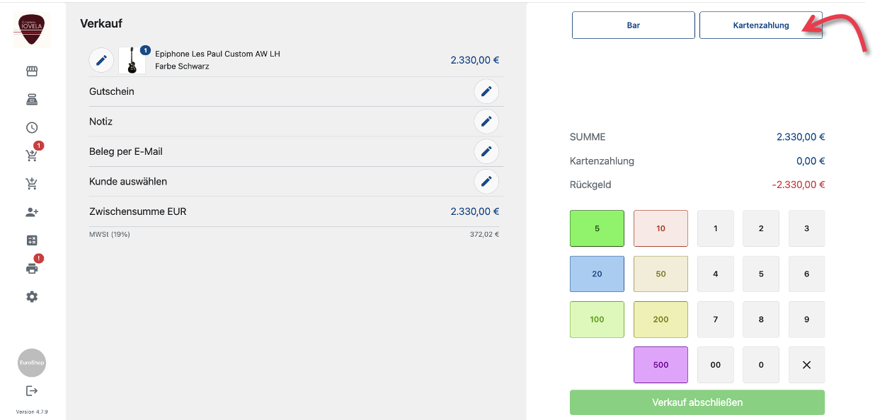 | Kassen-Display: Zahlung abgeschlossen | Jetzt noch den Beleg ausgeben und dem Kunden viel Spaß mit der neuen Gitarre wünschen. | |