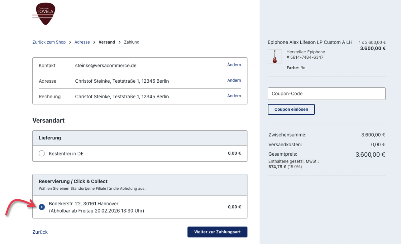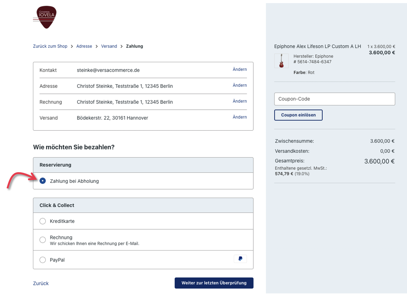 Wähle Zahlung bei Abholung als Zahlungsart: